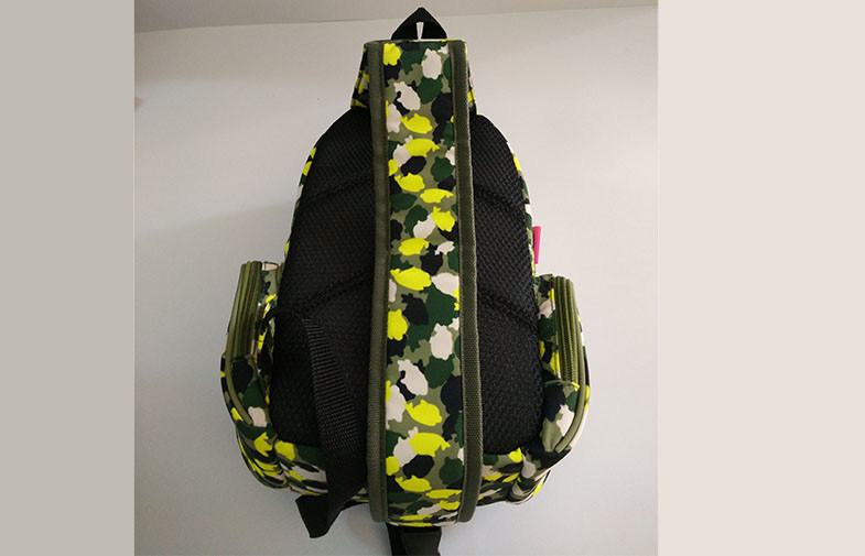 ② Its front is color printing,Its side is. a little curved .the surface is similar to rough. There's a good quality sweat sponge on the back of it.And There's thick bottom at the bottom.There's segmentation layer in it.Its side include two zipper pocket.Its rim contains cloth wrapping